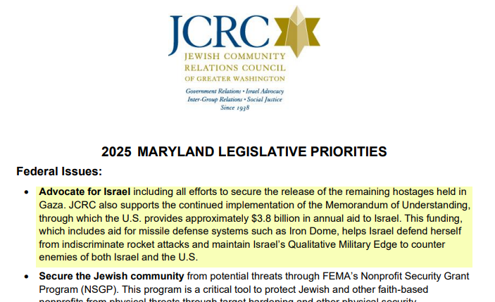There has been no love lost between the Jewish Community Relations Council of Greater Washington (JCRC) and Metro DC DSA. The JCRC is a liberal Zionist project that conflates its pro-Israel advocacy with progressive causes. In its 2025 Maryland legislative priorities, the JCRC marked its first cause as “Advocate for Israel.” Progressive causes like gun violence prevention and reproductive healthcare make the list but are buried beneath the higher priorities of advocacy for Israel and the US security state. Through its ongoing spat with Maryland Senator Chris Van Hollen, the JCRC reveals its public role — to attack and demean progressive politicians until they are corralled back into silence on US bipartisan support for the genocide of Palestinians and war abroad. Stymied by Van Hollen, however, JCRC needs an easier target. In this election cycle, Metro DC DSA is their target due to our support of Palestine. Because they are a 501(c)3 nonprofit, JCRC is not allowed to engage in elections directly. Never fear, they found a way.